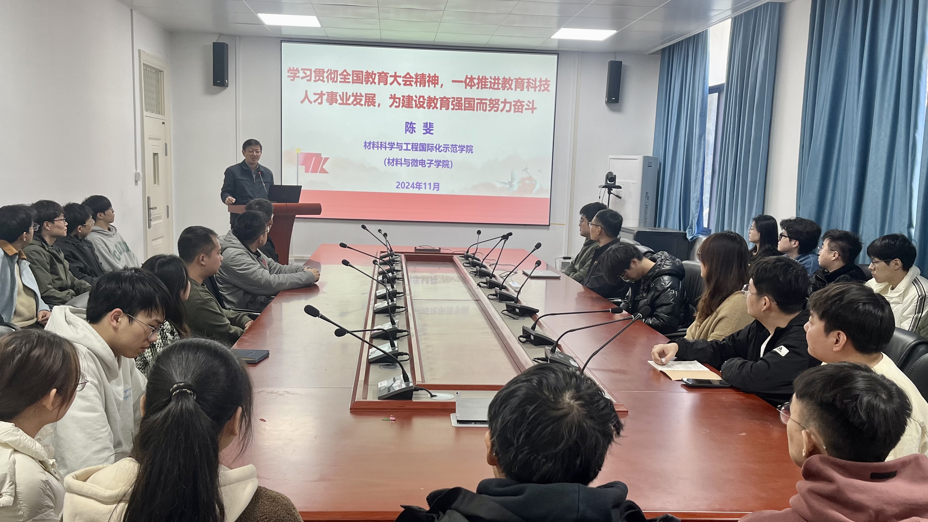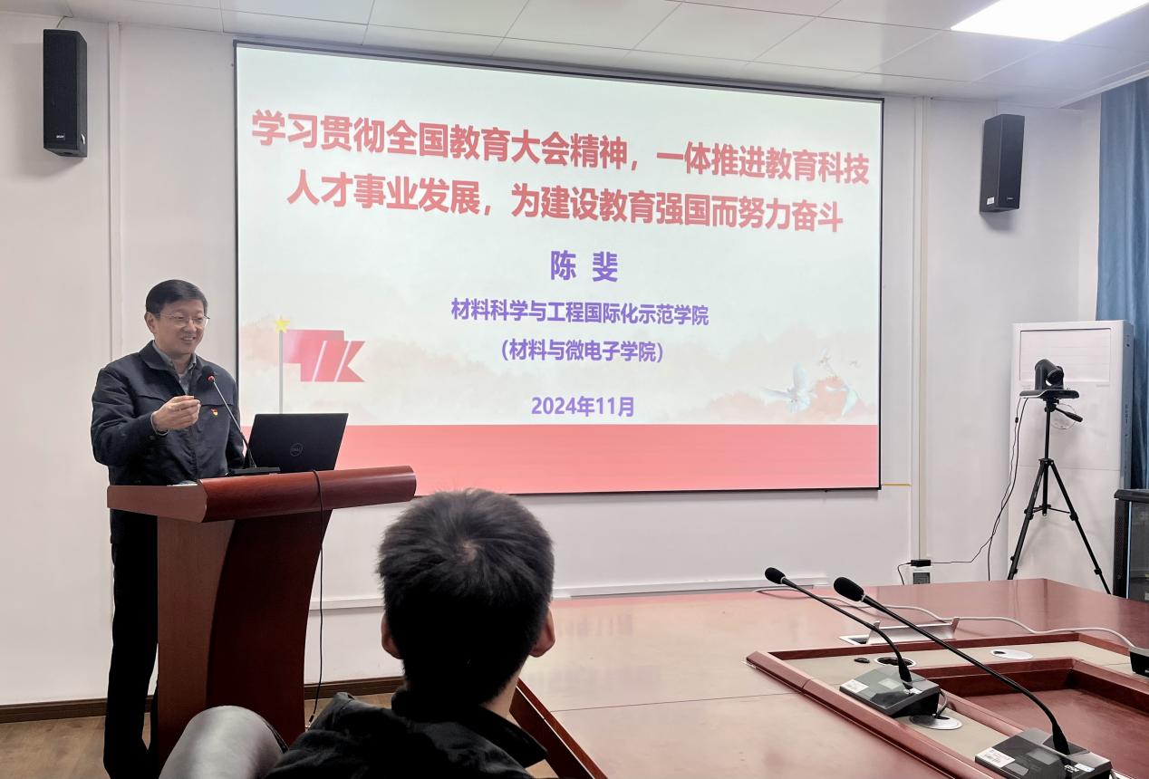 11月25日上午,性爱视频 副院长陈斐教授以“学习贯彻全国教育大会精神,一体推进教育科技人才事业发展,为建设教育强国而努力奋斗”为主题,从新时代我国科技事业取得的历史性成就、科技创新在教育和人才事业发展中的动力源作用和如何更好发挥科技在教育和人才事业中的动力源作用三个方面为功能梯度材料研究生党支部带来了一堂生动的专题党课。