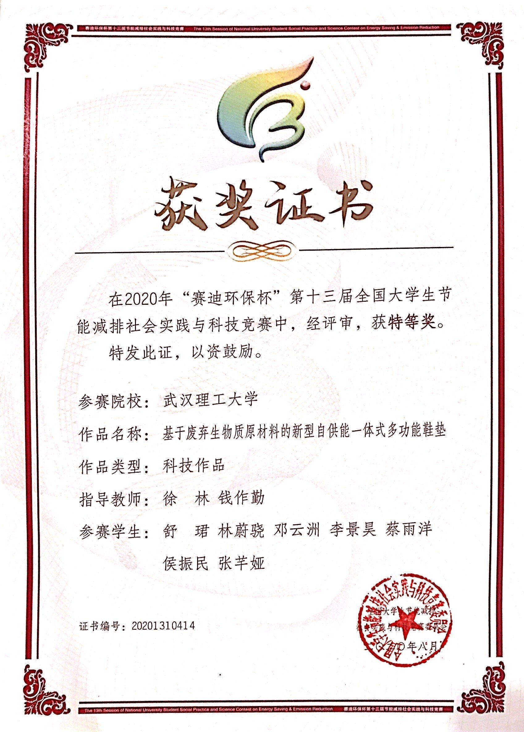 8月29日,由教育部高教司主办,并委托教育部高等学校能源动力学科教学指导委员会举办,重庆大学承办的2020年“赛迪环保杯”第十三届全国大学生节能减排社会实践与科技竞赛决赛落下帷幕。性爱视频 报送的参赛作品《基于废弃生物质原材料的新型自供能一体式多功能鞋垫》(指导老师:徐林、钱作勤,团队成员:舒珺等)荣获特等奖,实现新突破。